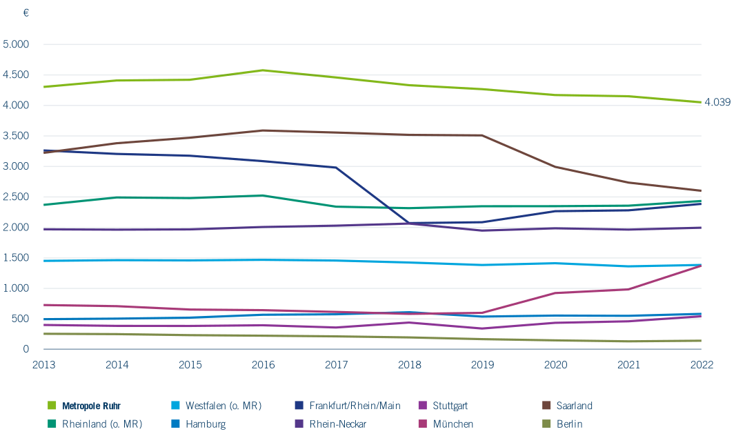 Abbildung 1.21 zeigt die durchschnittlichen Schulden der kommunalen Kernhaushalte pro Einwohner*in in Euro für die Vergleichsregionen. Die Schulden der Kernhaushalte umfassen Kassenkredite, mittel- und langfristige Kredite sowie Wertpapierschulden. Den höchsten Schuldenstand weist im Jahr 2022 mit 4.039 € pro Kopf (2018: 4.320 € pro Kopf) das Ruhrgebiet auf. Damit liegt es weit über dem Landeswert für NRW von 2.584 € pro Kopf und um ein Vielfaches höher als die Pro-Kopf-Schulden in den ostdeutschen Bundesländern, die noch geringere Schuldenstände als die Kommunen in Bayern insgesamt aufweisen (1.094 € pro Kopf). Der hohe Schuldenstand der Kommunen im Ruhrgebiet hat verschiedene Ursachen. Von besonderer Bedeutung sind die hohen Ausgaben für Sozialleistungen, die nicht vollumfänglich von Land und Bund übernommen werden, und die vergleichsweise geringen Gewerbesteuereinnahmen der Städte, die 2022 im Ruhrgebiet nur 622 € pro Einwohner*in betragen, während sie im Rheinland mit 961 € und in Westfalen mit 863 € pro Einwohner*in deutlich höher liegen (Vierteljährliche Kassenstatistik, Landesdatenbank NRW).