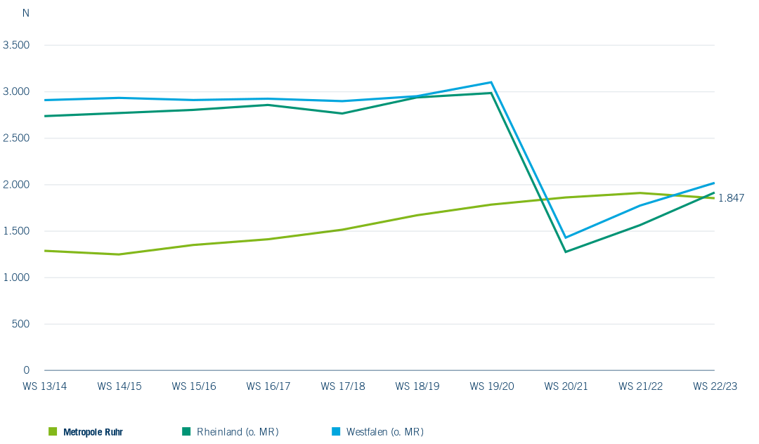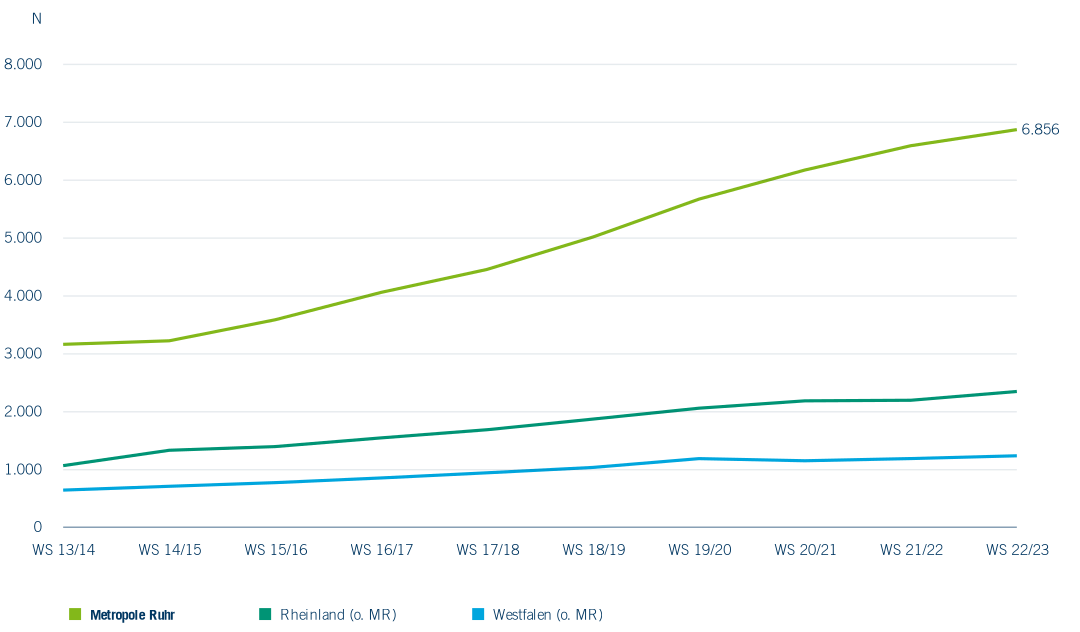Schließlich kann allgemeine Weiterbildung an Universitäten auch über das Alter der Studierenden definiert werden. Dem liegen zwei Prämissen zugrunde. Erstens wird angenommen, dass Personen über 55 mit großer Wahrscheinlichkeit bereits über eine berufliche Erstausbildung verfügen und – wo das tatsächlich nicht der Fall ist – keine Erstausbildung mehr aufnehmen. Zweitens kommt auch hier die bereits geschilderte Annahme zur Geltung, dass Studienabschlüsse keine größere Bedeutung hinsichtlich einer Verwertung auf dem Arbeitsmarkt haben, da die zu erwartenden Renditen geringer sind als die direkten und indirekten Kosten einer solchen Investition und dementsprechend auch keiner rationalen Intention entsprechen. Diese Annahme widerspricht jedoch Konzepten des lebenslangen Lernens und der Logik einer Aufrechterhaltung der Beschäftigungsfähigkeit gerade auch in der zweiten Lebenshälfte. Insgesamt weist die Statistik 116 Hochschulen aus, an denen Studierende im Alter von über 55 Jahren eingeschrieben waren oder sind. Im Gegensatz zu Gasthörern in der zweiten Lebenshälfte und Studierenden in Studiengängen ohne Abschluss handelt es sich bei Studierenden über 55 Jahren um keine marginale Gruppe. In den Regionen Rheinland, Westfalen und der Metropole Ruhr waren es 10.411 Studierende im WS 2022/23. Ältere Studierende sind eine zunehmend wichtige Zielgruppe der Hochschulen. Insbesondere die Metropole Ruhr weist hier hohe Zahlen auf. Das ist insbesondere auf die FernUniversität in Hagen zurückzuführen, deren Konzept in hohem Maße auch nicht traditionelle Studierende einschließt. Von den 6.856 im WS 2022/23 an den Hochschulen der Metropole Ruhr eingeschriebenen Studierenden waren 5.597 an der FernUniversität in Hagen immatrikuliert. Insgesamt ist ein steigender Trend zu beobachten. Der demografische Wandel wird diese Entwicklung möglicherweise weiter fördern.