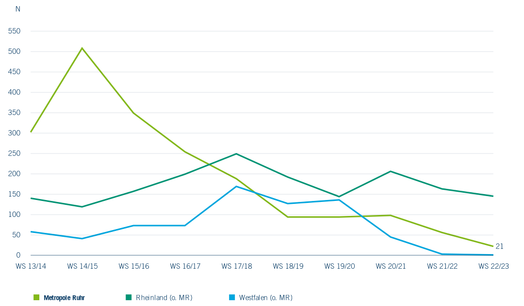 Ein weiterer Bereich von Weiterbildungsangeboten, welcher der allgemeinen Weiterbildung zugeordnet werden kann, betrifft Studiengänge ohne Abschluss oder Zertifikat. Hier ist anzunehmen, dass Teilnehmende bereits über einen Abschluss verfügen und das Studium nicht arbeitsmarktwirksam verwenden (können). Auch hier ist jedoch nicht auszuschließen, dass das erworbene Humankapital beruflich genutzt und damit Erwerbs- und Einkommenschancen verbessert werden können. Insgesamt gibt es jedoch nur sehr wenige Studierende in solchen Studiengängen (Abbildung 6.11). Insgesamt haben im Zeitraum WS 2013/14 bis WS 2022/23 28 Hochschulen in NRW 73 Studiengänge ohne Abschluss und Zertifikat angeboten. Eingeschrieben waren dort in den Wintersemestern jeweils nur wenige Hundert Studierende. Im WS 2013/14 waren es in der Metropole Ruhr 301. Im folgenden Wintersemester erreicht die Zahl mit 507 einen Höhepunkt. In der Metropole Ruhr ist die Zahl der Studierenden in solchen Studiengängen in den folgenden Jahren deutlich gesunken. Im WS 2022/23 waren es noch 21 Studierende. In den beiden Vergleichsregionen zeichnet sich ein ähnliches Bild ab. Im Rheinland stieg die Zahl der Studierenden in Studiengängen ohne Abschluss auf 248 im WS 2017/18 und ist im WS 2022/23 auf 144 gesunken. In Westfalen schließlich gab es im WS 2022/23 keine Studierenden mehr in derartigen Studiengängen. Insgesamt scheint dies nicht die Zukunft der allgemeinen Weiterbildung zu sein.