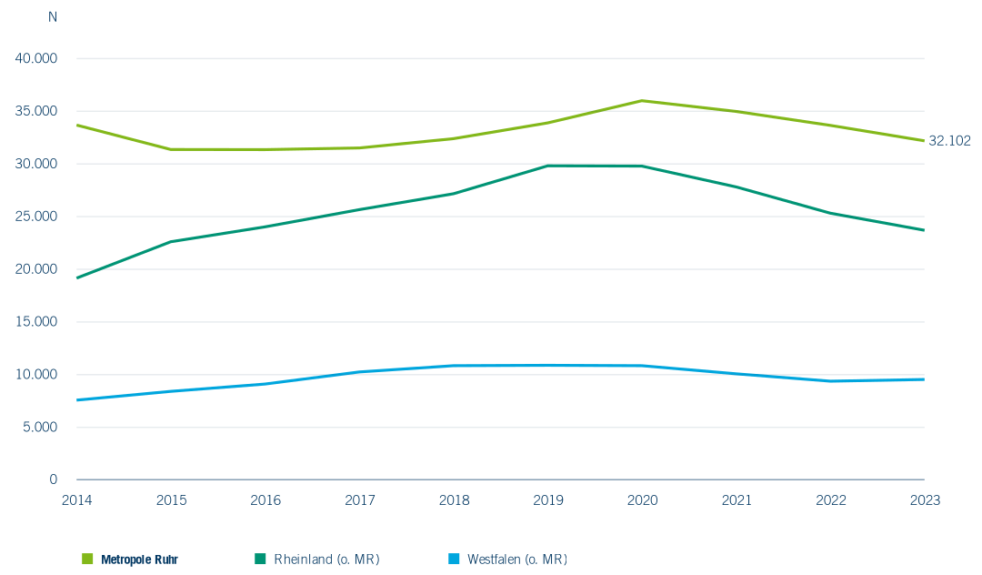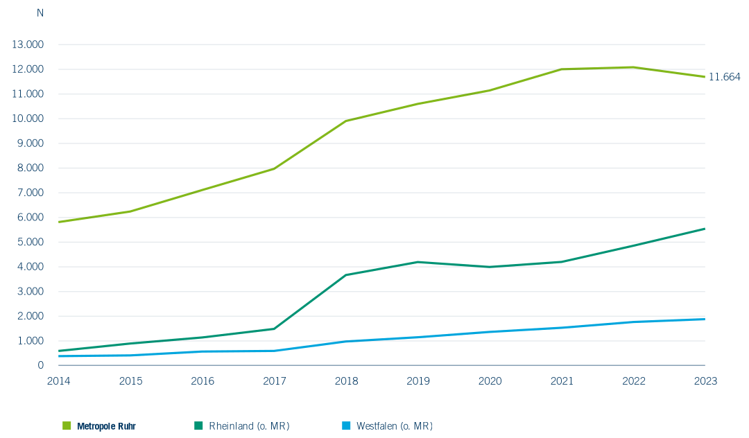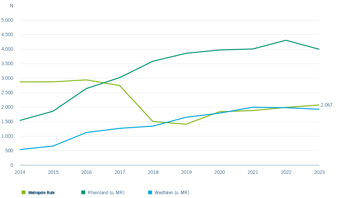 Eine vierte Variante der wissenschaftlichen Weiterbildung mit einem beruflichen Bezug ist das konsekutive Masterstudium in Teilzeit bzw. ein berufsintegrierendes duales Masterstudium. Diese Varianten implizieren ebenfalls eine aktuelle Berufstätigkeit und eine Zugangsberechtigung zu einem Hochschul- oder Universitätsstudium. Das ist in der Regel neben der Allgemeinen oder fachgebundenen Hochschulreife eine abgeschlossene Berufsausbildung. Die Zahl der Studierenden in diesen Studiengängen ist in allen Regionen kontinuierlich gestiegen (Abbildung 6.23). Nur in der Metropole Ruhr, ist die Studierendenzahl zum letzten Beobachtungszeitpunkt 2023 gesunken. Das Bild wird in der Metropole Ruhr, aber auch in ganz NRW durch die FernUniversität in Hagen geprägt. Vom WS 2013/14 bis WS 2022/23 ist allein an diesem Standort die Studierendenzahl in Studiengängen des konsekutiven Masters in Teilzeit bzw. des berufsintegrierenden dualen Masterstudiums von 5.020 auf 8.214 gestiegen. Mehr als 70 % aller Studierenden in der Metropole Ruhr in diesem Studienprofil sind in Hagen eingeschrieben. Auch im Rheinland gibt es größere Anbieter, die hier die Landschaft prägen. Seit dem WS 2017/18 ist die FOM Hochschule für Ökonomie und Management in Köln und Düsseldorf sehr aktiv. Die Zahl der Studierenden in einem konsekutiven Masterstudium in Teilzeit bzw. einem berufsintegrierenden dualen Masterstudium ist an dieser Hochschule von elf im WS 2016/17 auf 2.726 im WS 2017/18 gestiegen. Der in diesem Zeitraum im Rheinland beobachtbare Anstieg ist auf diese Veränderung zurückzuführen. Auch in Westfalen ist die Zahl der Studierenden gestiegen, jedoch auf einem insgesamt geringeren Niveau.