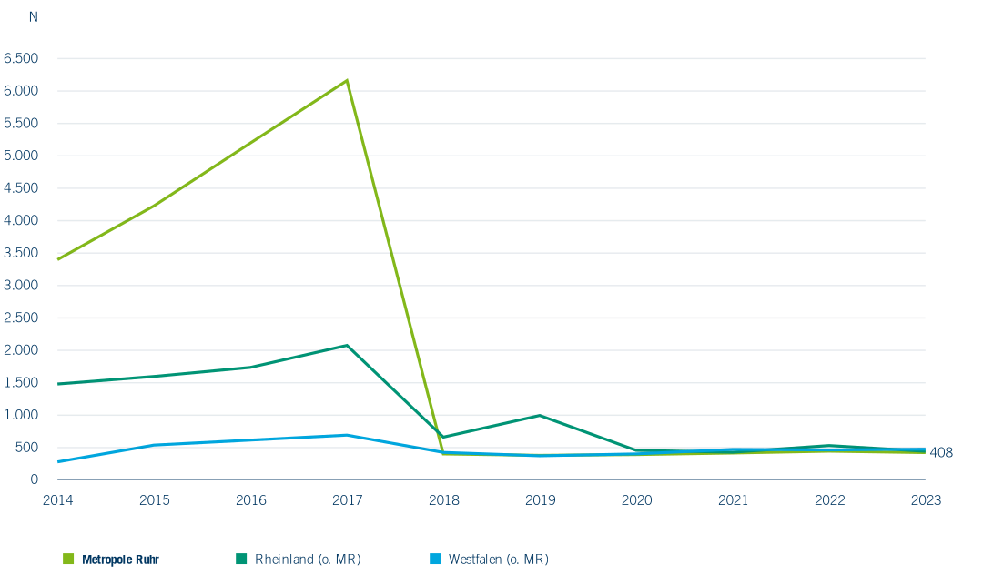 2023 Aufbaustudiengänge angeboten. Das Angebot umfasste 136 Studiengänge. Auch hier unterscheidet sich die Entwicklung zwischen den Regionen deutlich (Abbildung 6.22). In der Metropole Ruhr ist die Zahl der Studierenden in Aufbaustudiengängen bis WS 2016/17 stark gestiegen und dann abrupt eingebrochen. Auch hier ist die markante Entwicklung der Region auf die Veränderung bei nur einem Anbieter – FOM Hochschule für Ökonomie und Management Essen – zurückzuführen. Die Zahl der Studierenden in einem Aufbaustudium ist bei diesem Anbieter vom WS 2013/14 bis WS 2016/17 von 2.798 auf 5.223 gestiegen und im Folgejahr auf 0 gesunken. Auf denselben Anbieter – an anderem Standort – ist auch die Veränderung im Rheinland zurückzuführen. Die Zahl der Studierenden in einem Aufbaustudium ist bei der FOM Hochschule für Ökonomie und Management in Köln und Düsseldorf zusammen von 1.342 im WS 2016/17 auf 0 in WS 2017/18 gefallen. Die Entwicklung in Westfalen hingegen ist relativ stabil. Auch hier ist beim selben Anbieter in Münster und Siegen die Zahl der Studierenden im selben bereits beobachteten Zeitraum auf 0 gefallen, allerdings von einem geringen Level aus. Das macht deutlich, wie stark die Berichterstattung zum Teil von einzelnen Akteuren und deren Berichtswesen abhängt. Auszuschließen ist nicht, dass hier verwaltungstechnische Artefakte beobachtet werden.